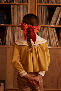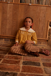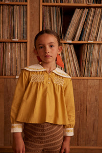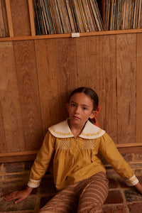The sweet new vintage-inspired June blouse comes in our honey cotton-linen. Featuring contrast collar and cuffs with pretty linear embroideries, and hand smocking at chest with three button fastening. We love June layered under pinafores, and her sweet shape styles perfectly with our Molly and Wini trousers.
