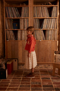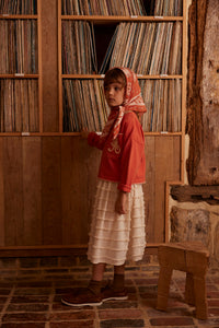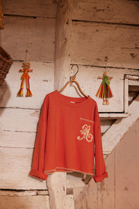 A long sleeve version of our favourite Rumi tee, ideal for everyday styling. In our highlight tone for the season ‘Poppy’. Contrast ivory blanket stitch finishing and our signature branded ‘A’ embroidery adorn the pocket. We love Rumi worn with our skirts or layered under pinafores to bring an extra pop of colour.